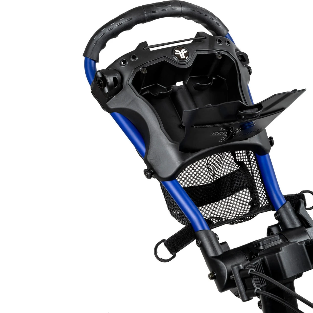 Um Ihr Zubehör wie Bälle, Tees und Scorekarte zu verstauen, verfügt der Trolley über eine praktische Aufbewahrungsbox und ein Aufbewahrungsnetz. Auch eine Halterung für Ihr Smartphone ist bereits am Trolley verbaut.