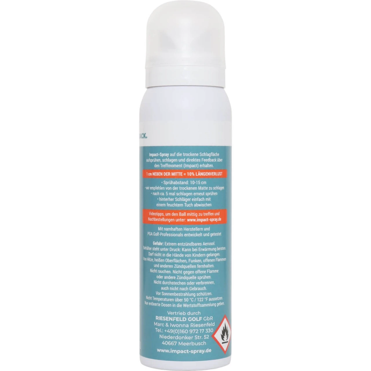 Das Impact Spray in der kleinen, handlichen Dose ist ein effizientes Trainingstool und passt in jede Golftasche. Der Inhalt der Dose reicht für etwa 200 Sprühstöße. Mit jedem Sprühstoß lassen sich bis zu 5 Schläge realisieren. Dadurch kann man mit einer Flasche Impact Spray zwischen 800 und 1.000 Schläge machen. Inhalt 100 ml.