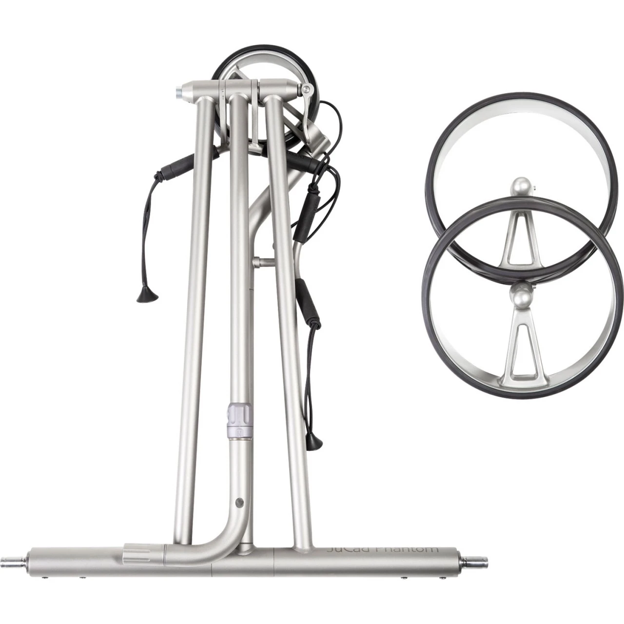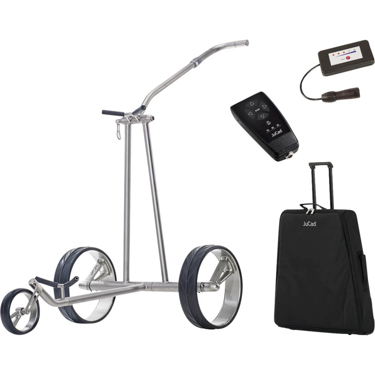 Der JuCad Phantom Titan eX 2.0 Elektro-Trolley bietet ein sportliches Handling und eine lange Akkulaufzeit. Er besticht durch sein elegantes Erscheinungsbild und bewegt sich mit seinen innovativen Einspeichenfelgen aus Vollcarbon nahezu schwebend über das Fairway. Das intelligente Technikpaket sorgt für weiteren Komfort und setzt sich aus einem leisen Brushless Motor mit beidseitiger Parkbremse sowie einem Magnetstecker und einer integrierten Ladestandsanzeige zusammen. Dank seiner komfortablen Falttechnik kann der Trolley in Sekundenschnelle auf ein superflaches Packmaß gebracht werden. Höchsten Fahrkomfort bieten der schlanke und extrem steife Titanrahmen, das kraftvolle und leise Antriebssystem sowie die optionale Fernsteuerung. Ein besonderes Highlight ist auch das JuCad Powerlock-System, das gleichzeitig die Fixierung der oberen Baghalterung sowie der Griffstange ermöglicht.