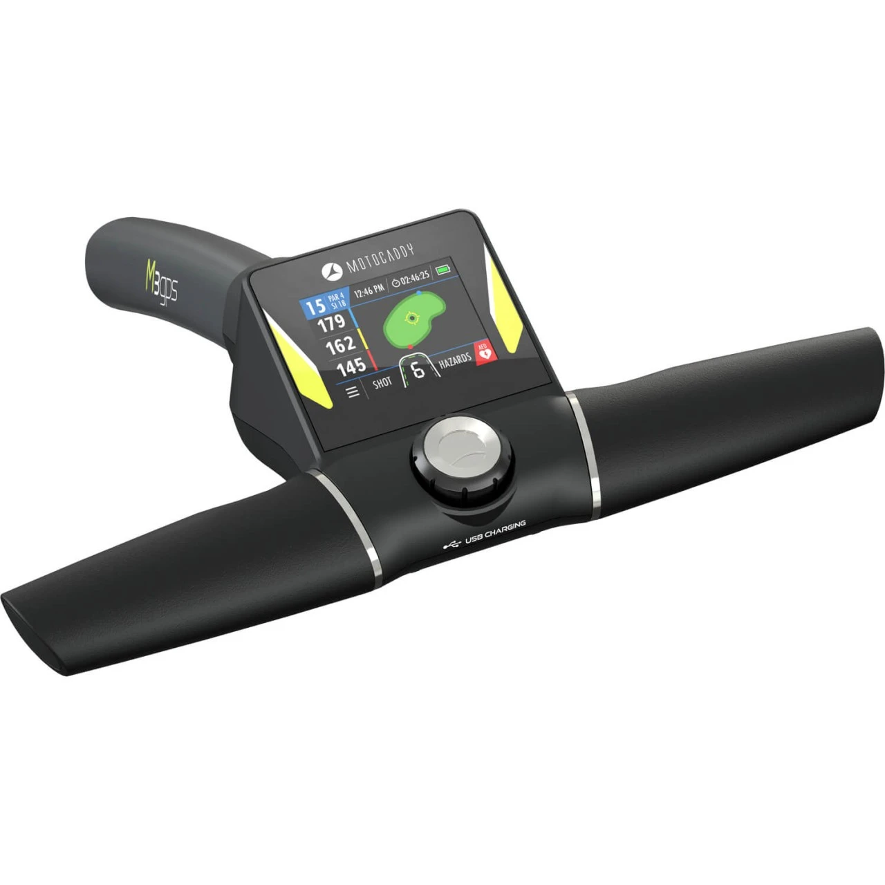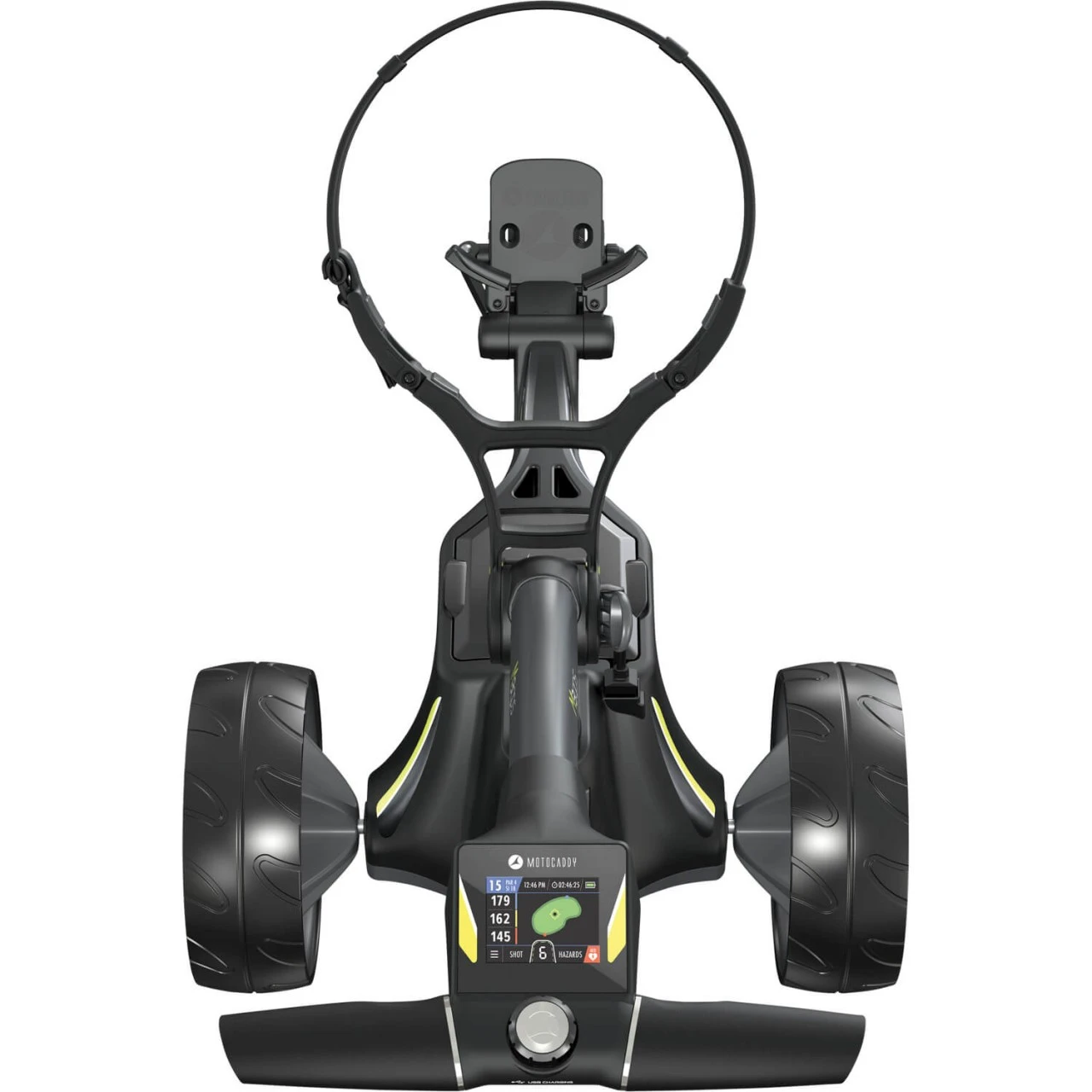 Der Elektrotrolley M3 GPS Lithium von Motocaddy zeigt auf dem hochauflösenden 2,8-Zoll-LCD-Touchscreen-Display Entfernungsangaben zu Anfang, Mitte und Ende des Grüns sowie zu den wichtigsten Hindernissen auf der Bahn. Über Bluetooth® lässt sich eine Verbindung zur Mootocaddy GPS-App herstellen, wodurch Platzdaten aktualisiert und Smartphone-Nachrichten erhalten werden können.