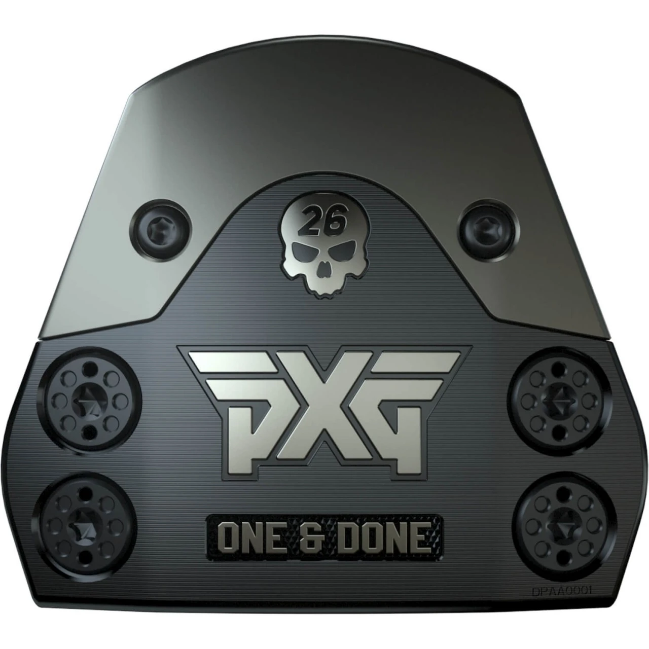 Der One & Done Putter von PXG ist Teil der Battle Ready-Serie und besitzt eine Mallet-Form sowie prominente Ausrichtungshilfen in Form von Linien und einem Kreis. Diese erhöhen das Selbstvertrauen und helfen dabei, Putts zielsicher einzulochen. Die Konstruktion aus Aluminium und Wolfram sowie der extra tiefe Schwerpunkt mit anpassbaren Sohlengewichten optimieren das MOI und verbessern Stabilität und Konstanz.